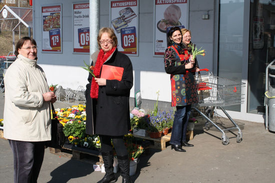Mit einer spontanen Aktion erinnerte die SPD am Internationalen Frauentag (seit 100 Jahren alljährlich am 8. März) an die Notwendigkeit, weiter für die tatsächliche Gleichstellung von Männern und Frauen zu arbeiten. Neben dem ernsten Thema gab´s für die Passantinnen Frühlingsgrüße in Gestalt von Tulpen.