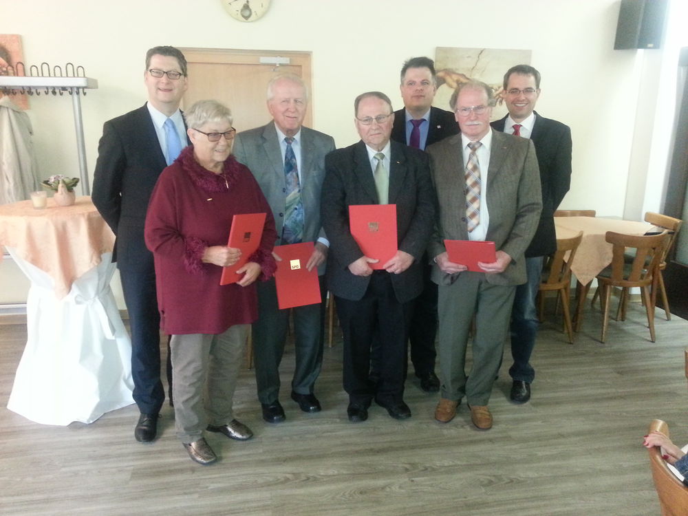 Ortsvereinsvorsitzender David Rauber dankte den Geehrten für ihre tatkräftige Mitarbeit und ideelle und finanzielle Unterstützung. Mit Günter Nell und Bernd Heddrich konnten zwei der Geehrten auch auf eine langjährige kommunalpolitische Arbeit in den Gemeindegremien zurückblicken. So war Günter Nell lange Jahre Mitglied der Gemeindevertretung und des Ehringshäuser Ortsbeirats, dem er acht Jahre lang als Ortsvorsteher vorsaß. Bernd Heddrich war zunächst ab 1968 bis 1983 immer wieder in Gemeindevertretung und Gemeindevorstand, später dann im Kreistag aktiv und zog 2011 nach längerer Pause wieder in den Gemeindevorstand ein. „Ihr habt Euch viele lange Abende um die Ohren gehauen und viel für unsere Gegend und ihre Menschen bewegt,“ sagte Rauber, der den Jubilaren weiter viel Glück, Gesundheit und Lebensfreude wünschte. Die Ehrungen nahmen dann Schäfer-Gümbel, der heimische Landtagsabgeordnete Stephan Grüger und David Rauber vor. Der Männerchor des MGV Harmonie Daubhausen umrahmte die Feierstunde.